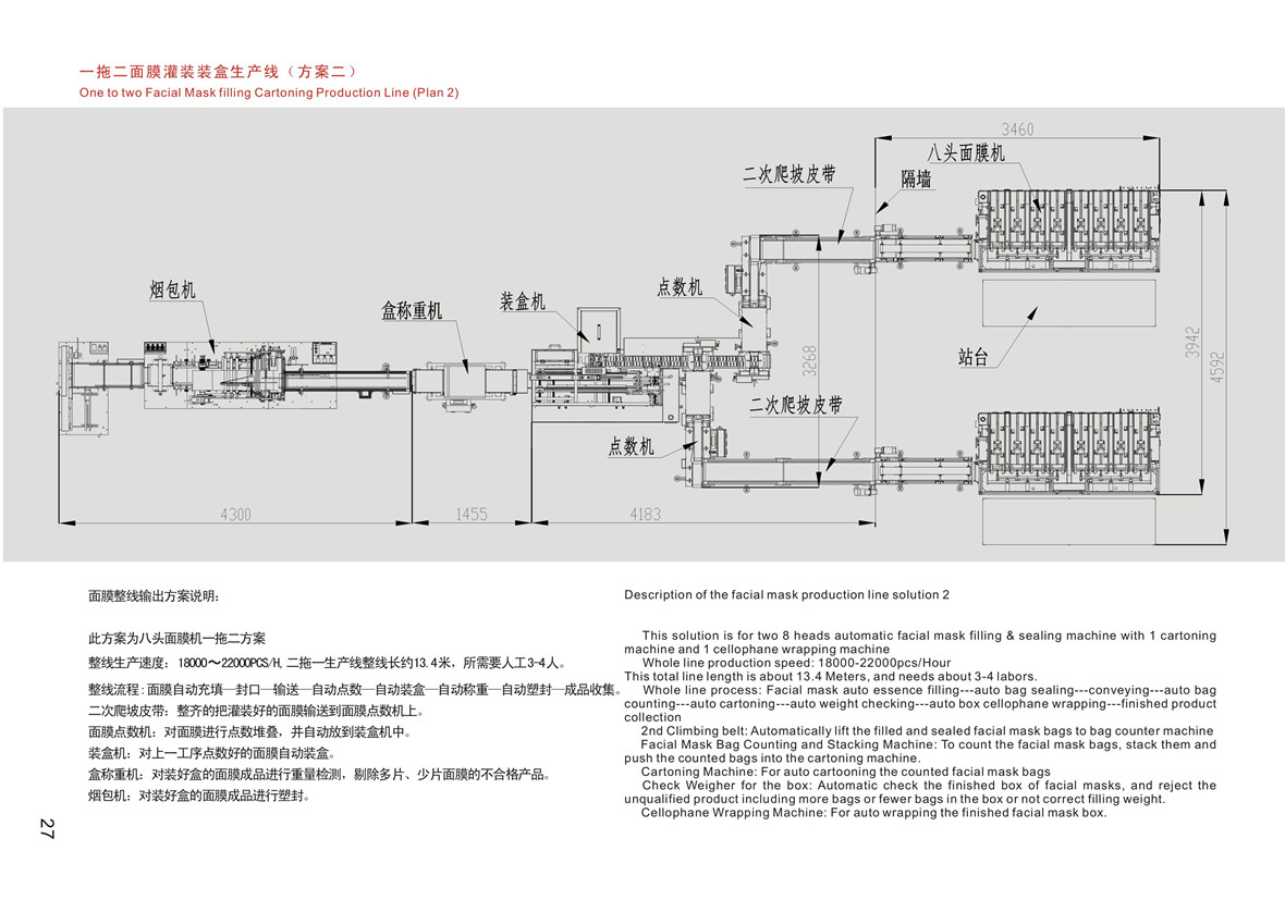 整線生產(chǎn)速度:18000~22000PCS/H 二拖一生產(chǎn)線整線長約13.4米,所需要人工3-4人。