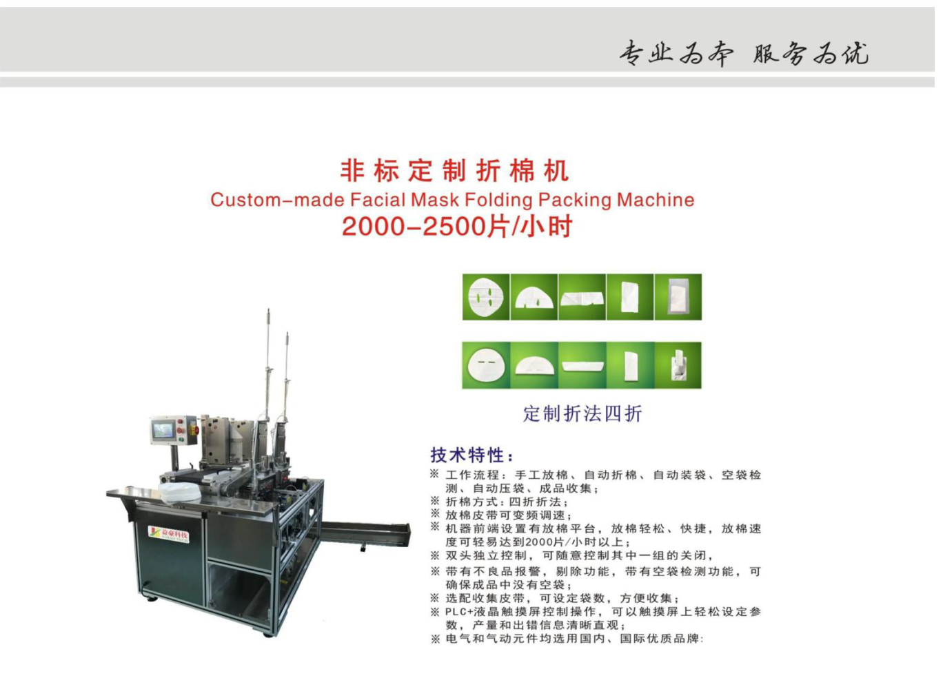 動(dòng)作流程Working procedure | 手工放棉、自動(dòng)疊棉、自動(dòng)裝袋、空袋檢測(cè)、自動(dòng)壓袋、成品輸出 Put the dry facial mask sheet and bags by hands- auto facial mask sheet folding- auto facial mask bag picking up and opening – Auto empty bag checking—Auto bag pressing-- auto bagging output |