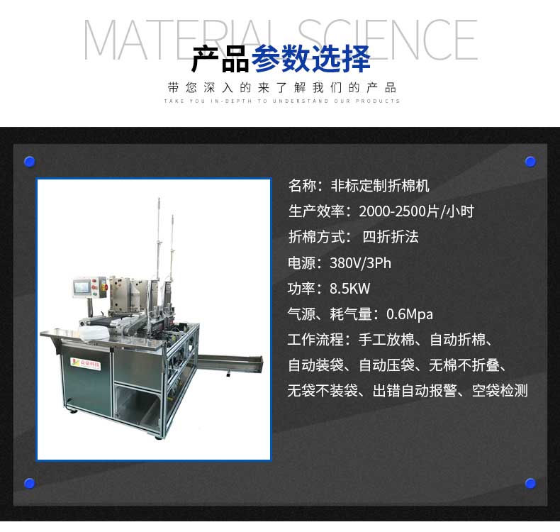 1、工作流程:手工放棉、自動(dòng)折棉、自動(dòng)裝袋,自動(dòng)壓袋、無(wú)棉不折疊,無(wú)袋不裝袋,出錯(cuò)自動(dòng)報(bào)警,空袋檢測(cè);