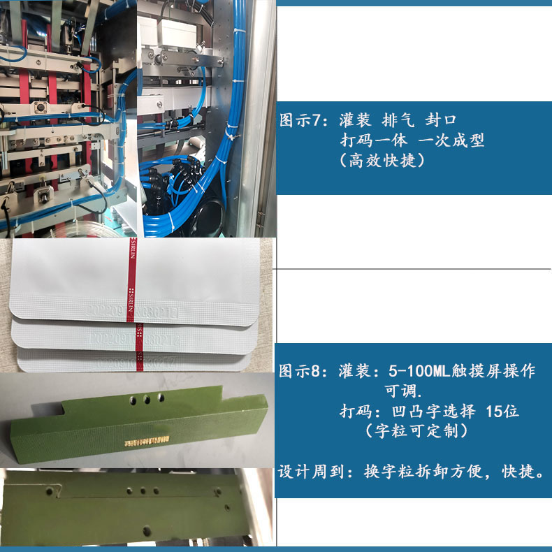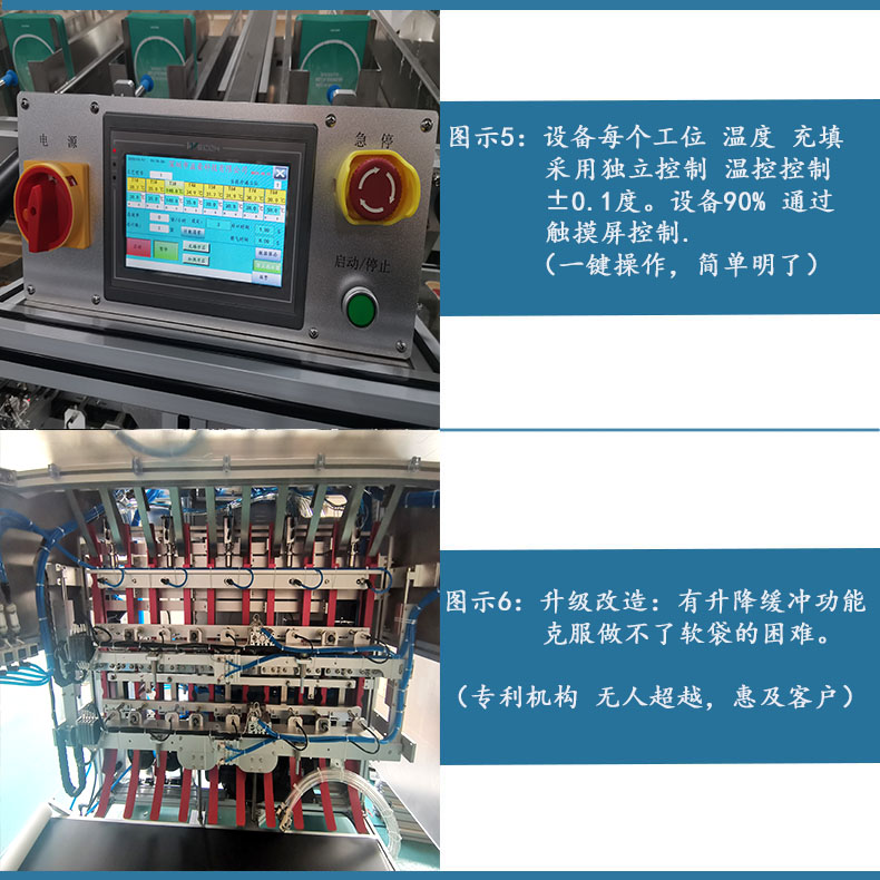 1、自動(dòng)下袋、自動(dòng)填充、自動(dòng)封口、打碼、成品輸出、自動(dòng)計(jì)數(shù),無(wú)袋不充填,無(wú)袋不封口;