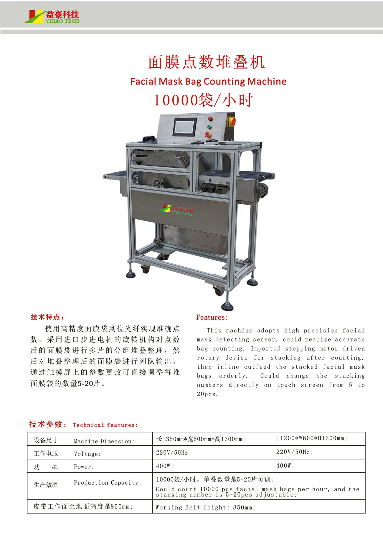 使用高精度面膜袋到位光纖實(shí)現(xiàn)準(zhǔn)確點(diǎn)數(shù),采用進(jìn)口步進(jìn)電機(jī)的旋轉(zhuǎn)機(jī)構(gòu)對(duì)點(diǎn)數(shù)后的面膜袋進(jìn)行多片的分組堆疊整理,然后對(duì)堆疊整理后的面膜袋進(jìn)行列隊(duì)輸出。通過(guò)觸摸屏上的參數(shù)更改可直接調(diào)整每堆面膜袋的數(shù)量5-20片。