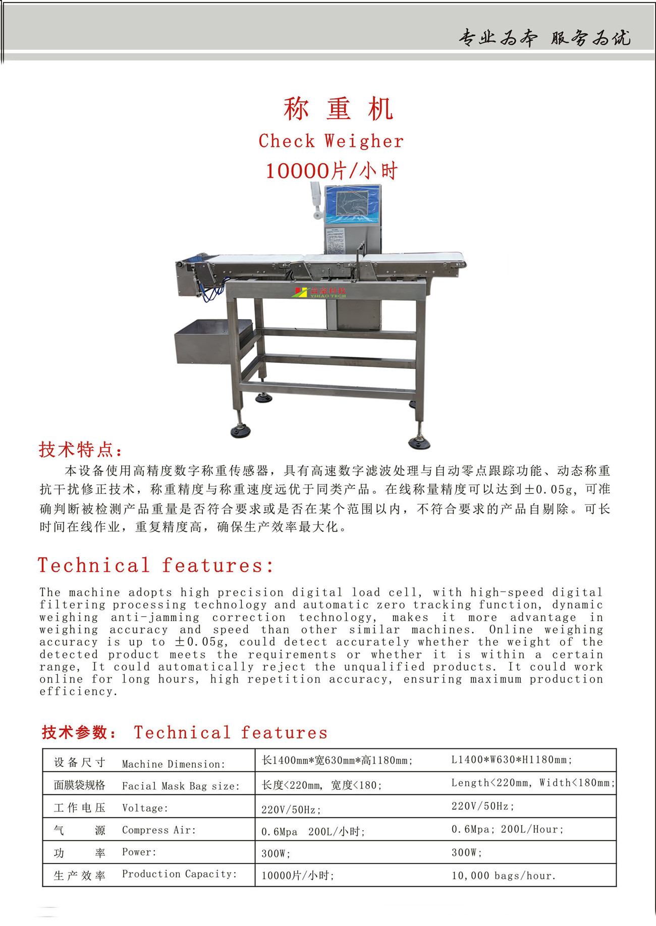 本設(shè)備分提速段、稱重段、傳送段(同時(shí)具有翻版剔除),使用高精度數(shù)字稱重傳感器,具有高速數(shù)字濾波處理與自動(dòng)零點(diǎn)跟蹤功能、動(dòng)態(tài)稱重抗干擾修正技術(shù),穩(wěn)重精主與稱重度遠(yuǎn)優(yōu)于同類產(chǎn)品,在線稱量重復(fù)精度可以達(dá)到±0.5g(速度越低精度越高),可準(zhǔn)確判斷被檢測產(chǎn)品重量是否符合要求或是否在某個(gè)范圍以內(nèi),不符合要求的產(chǎn)品自動(dòng)剔除,可長時(shí)間在線作業(yè),重復(fù)精度高,確保生產(chǎn)效率最大化。