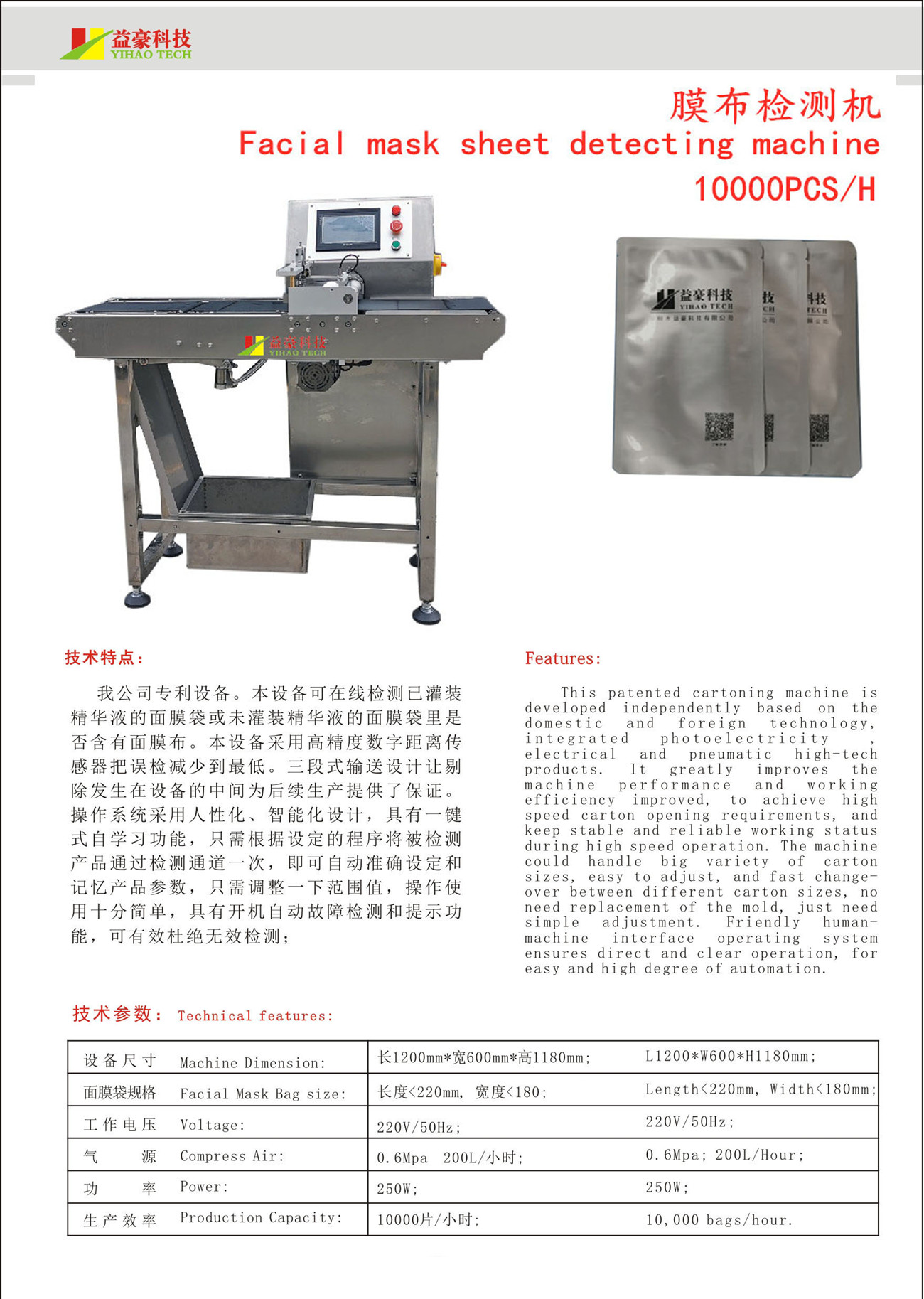我公司專利設(shè)備。本設(shè)備可在線檢測已灌裝精華液的面膜袋或未灌裝精華液的面膜袋里是否含有面膜布。本設(shè)備采用高精度數(shù)字距離傳感器把誤檢減少到最低。三段式輸送設(shè)計讓剔除發(fā)生在設(shè)備的中間為后續(xù)生產(chǎn)提供了保證。操作系統(tǒng)采用人性化、智能化設(shè)計,具有一鍵式自學(xué)習(xí)功能,只需根據(jù)設(shè)定的程序?qū)⒈粰z測產(chǎn)品通過檢測通道一次,即可自動準(zhǔn)確設(shè)定和記憶產(chǎn)品參數(shù),只需調(diào)整一下范圍值,操作使用十分簡單,具有開機(jī)自動故障檢測和提示功能,可有效杜絕無效檢測